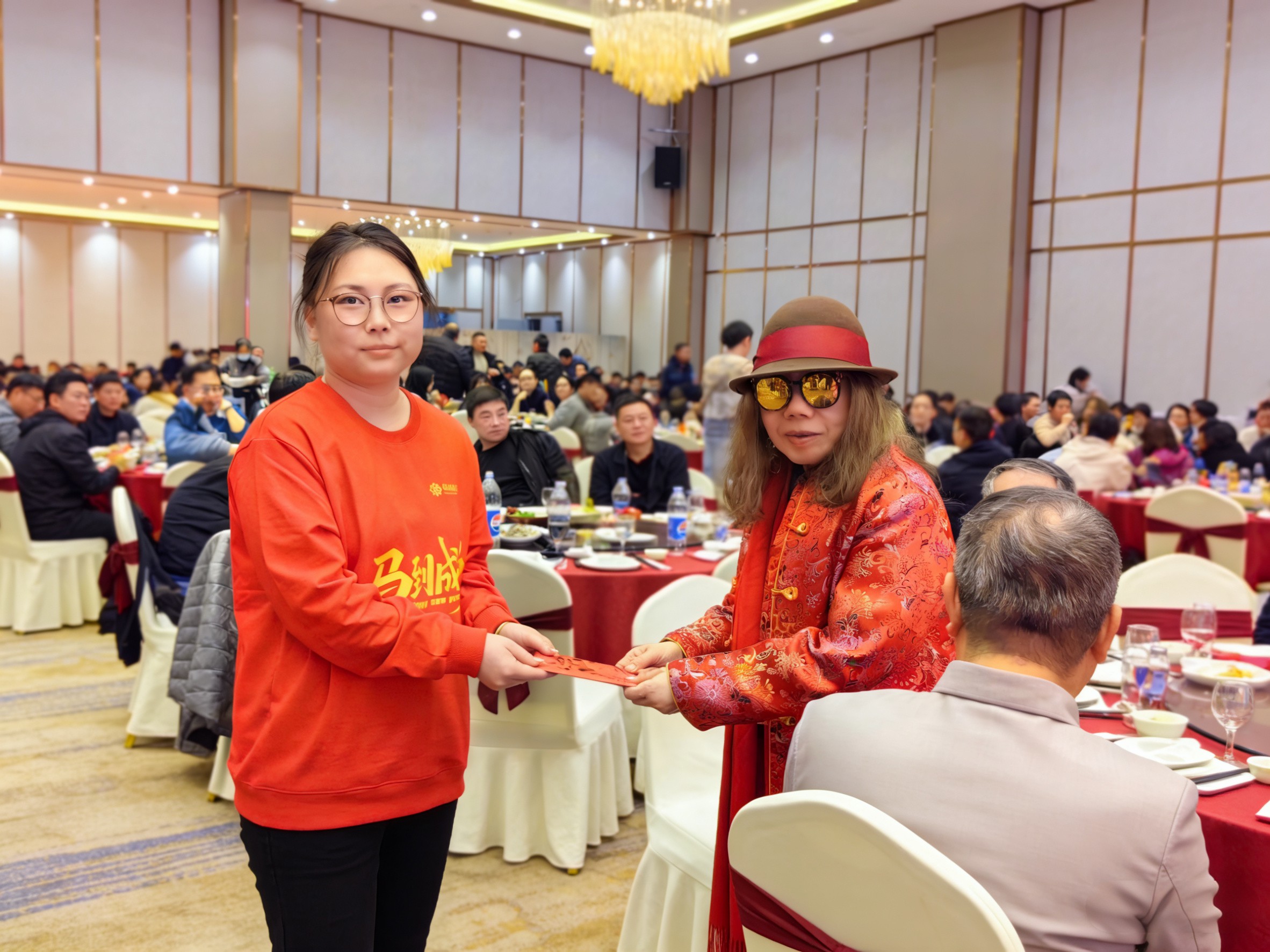 年会在各部门新春祝福视频中温馨开启,声声祝愿寄托着对集团发展的美好憧憬。总裁尹竣在致辞中,借用25年初申花队的战绩,鼓舞全体员工在新的一年中凝心聚力、再创佳绩。随后,股东李太太发表讲话,她充分肯定东冠集团2025年来取得的成绩,并对电商团队顺利入驻斯米克大厦表示祝贺。最后,李董致辞中谈及今日参观工厂的感受,对整洁有序的工作环境表示赞许,并对尹竣总裁带领团队取得的业绩给予充分肯定,期待集团在其带领下续写新篇。